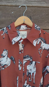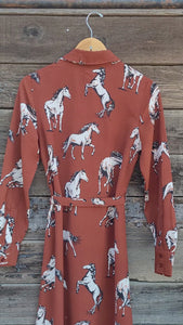 Cotton and Rye Brown Horse Print Dress.Full length, button down, long sleeved with self fabric tie. True to fit. Drapey, textured material.100% Poly