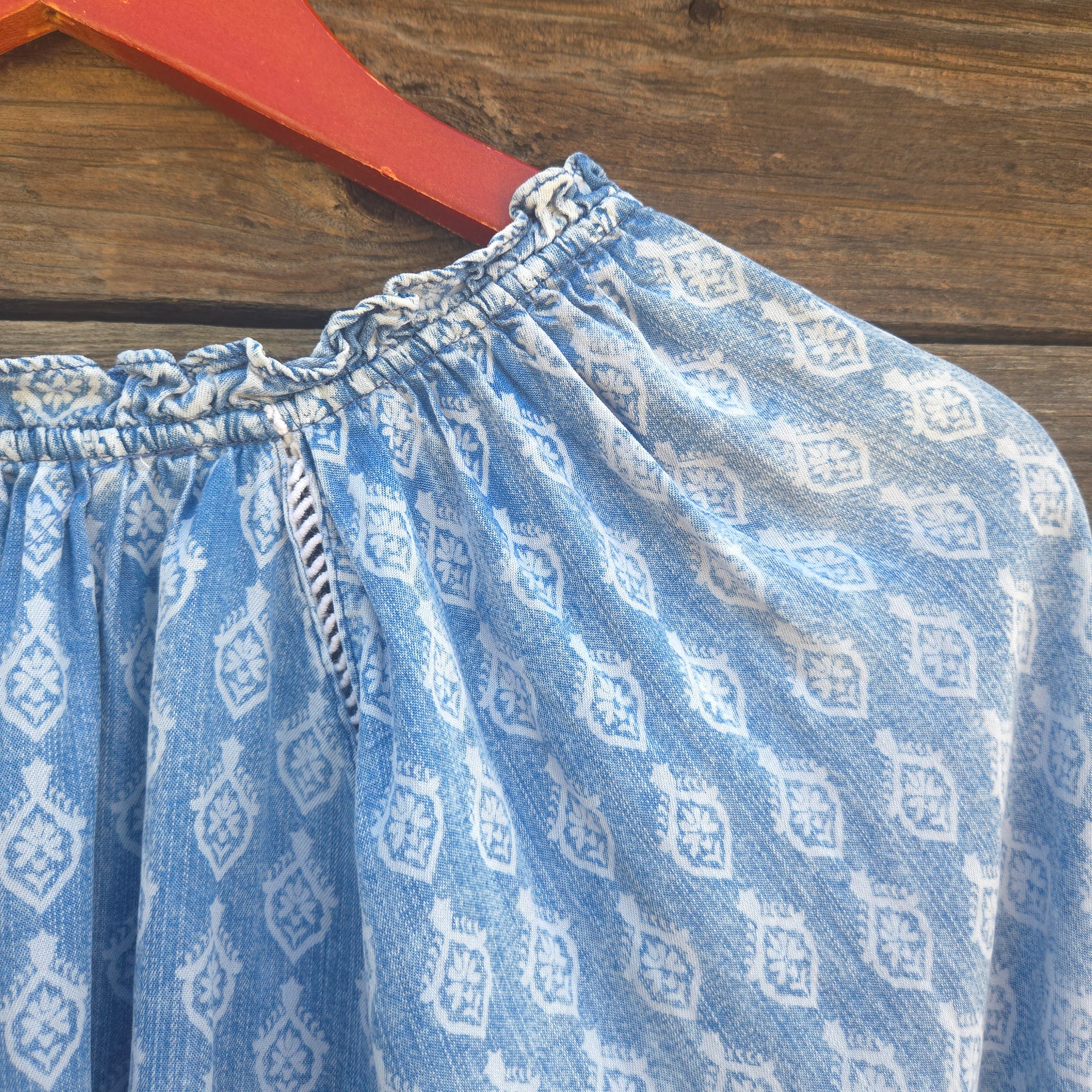 Dear John Denim Costa Blouse in Tencel Blue with a Tulip style pattern. Elbow length peasant sleeves, V-neckline, short ruffled detail and lattice decoration.