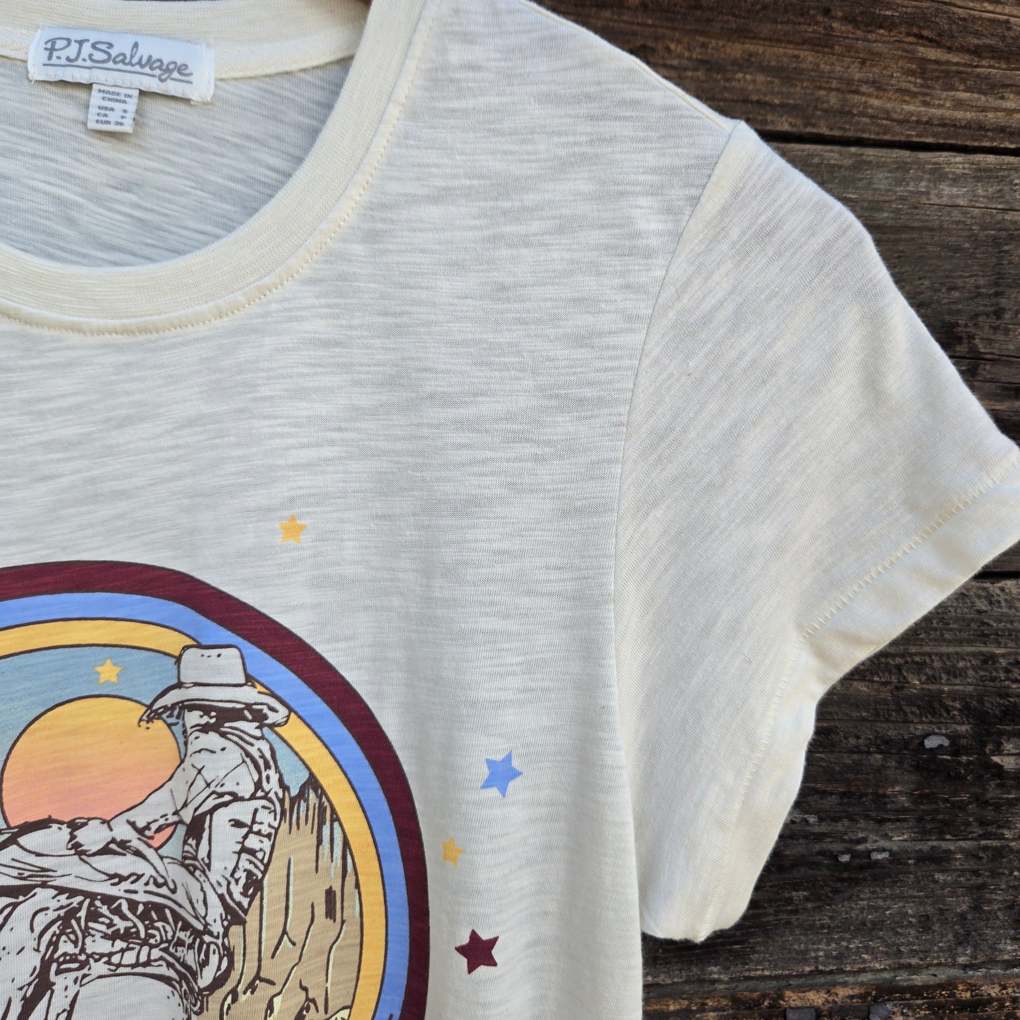 A graphic tee that tips its hat to Western nostalgia. This soft ivory style showcases a vintage-inspired bronc buster cowboy and rainbow sunset print, making it perfect for layering or wearing solo with your favorite denim.