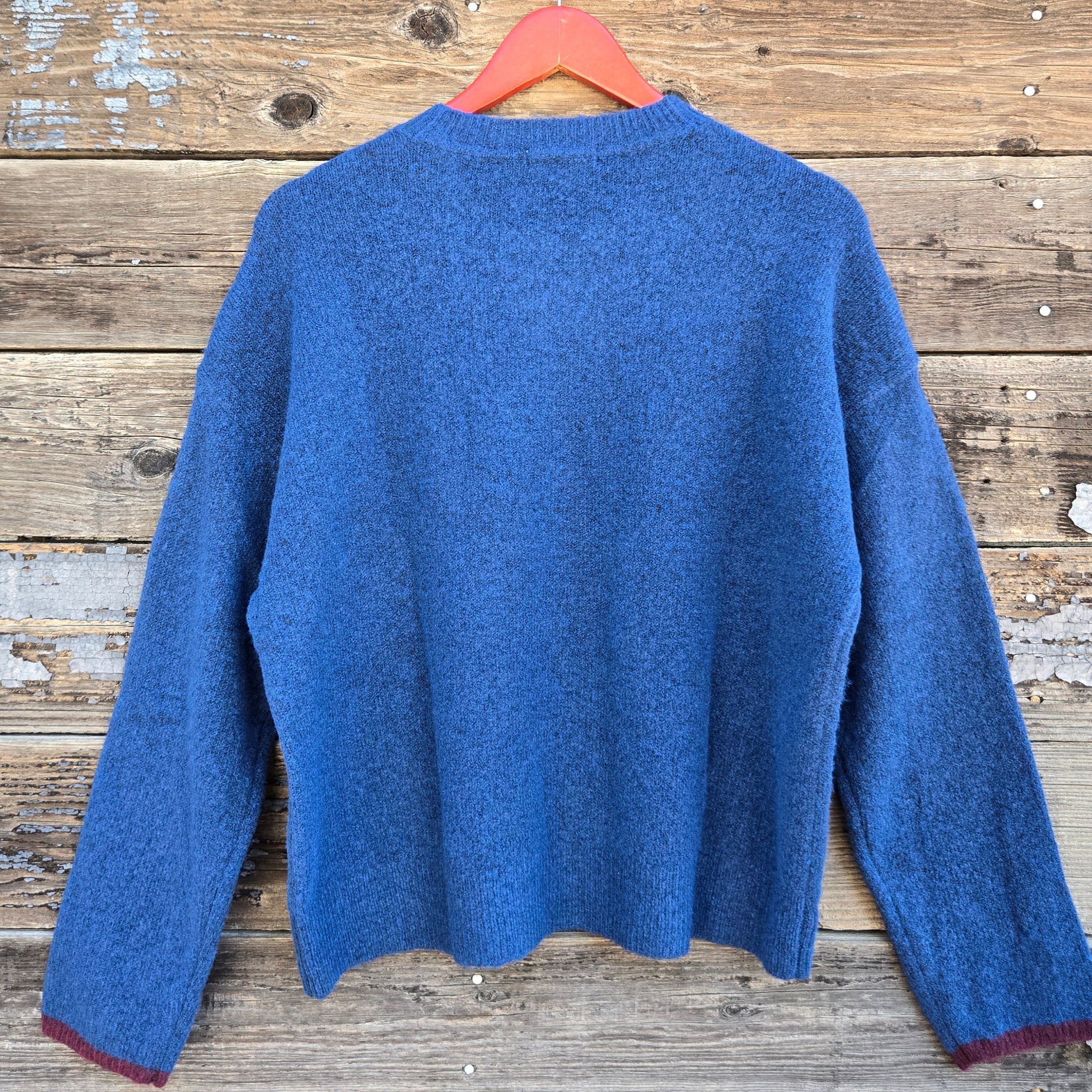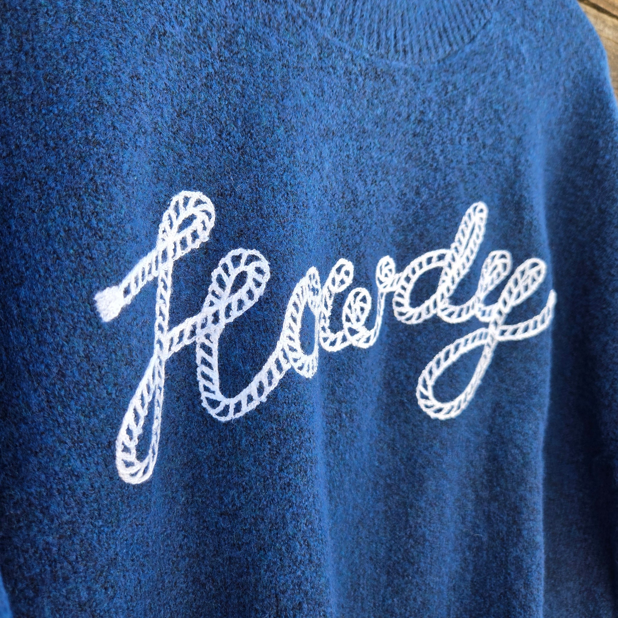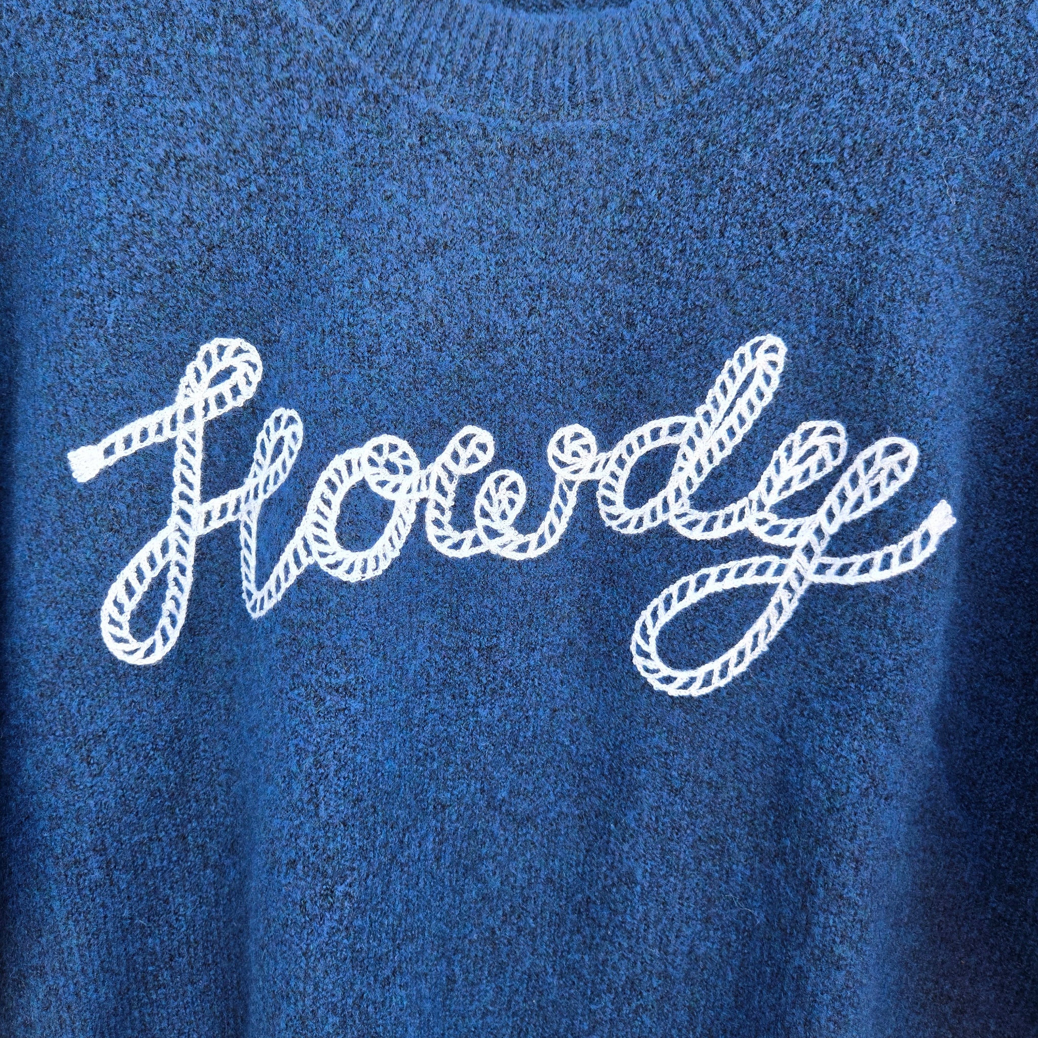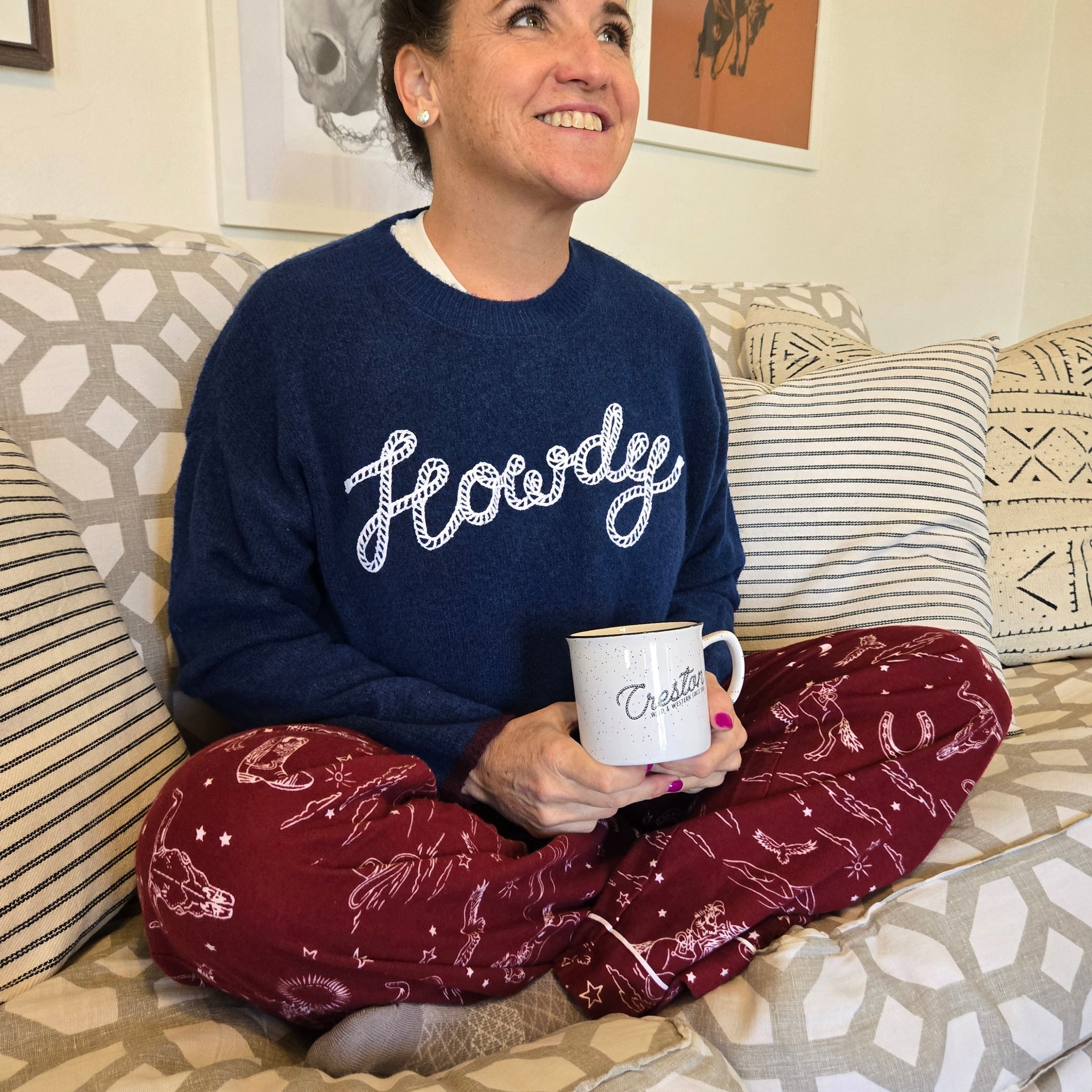 Soft, fuzzy, and made to be lived in—this snuggle sweater brings serious lounge appeal. The deep navy knit is plush and stretchy with a relaxed fit, finished with a rope-style “howdy” graphic for a little Western flair.
