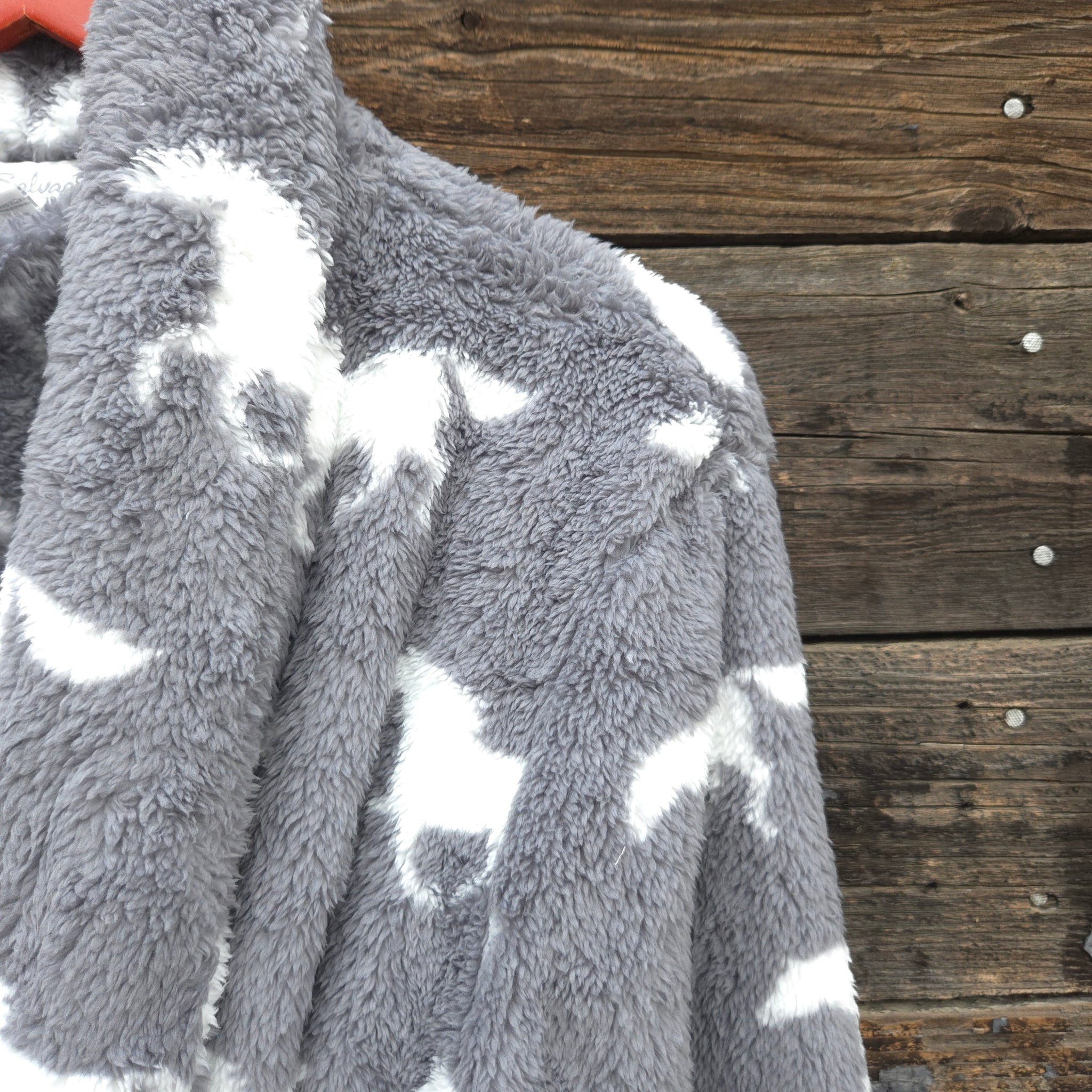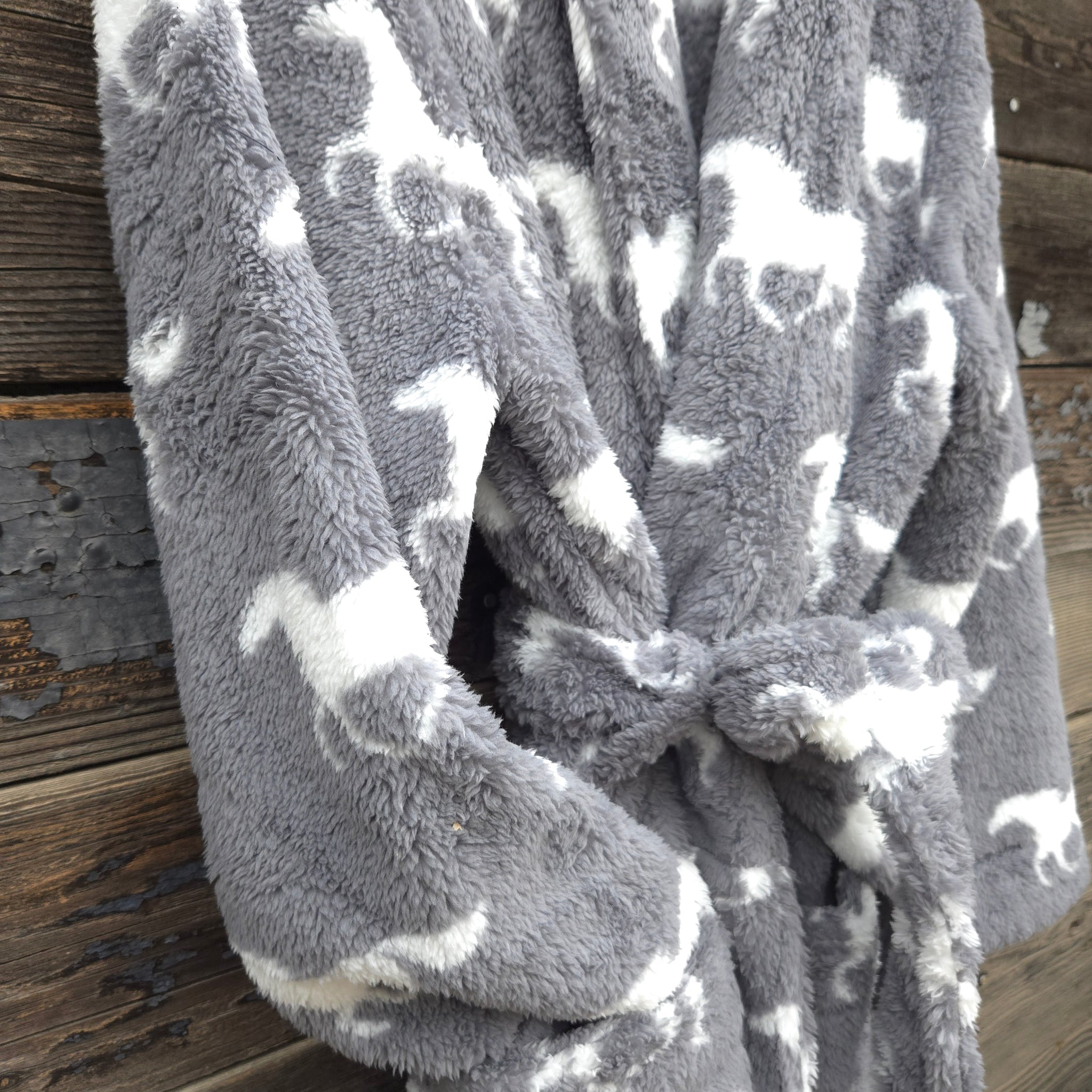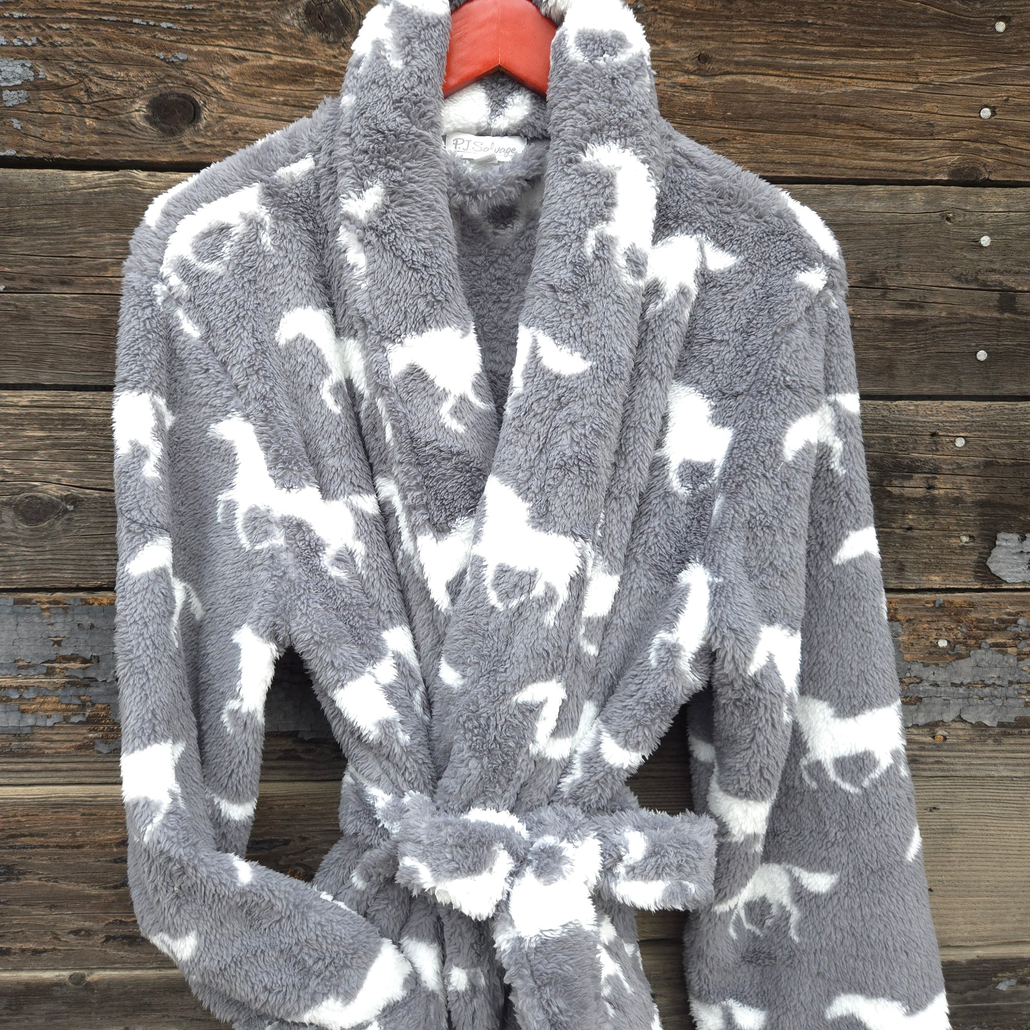 A horse girl's dream! Like being wrapped in a cloud on a chilly morning. This plush fleece robe in soft grey with a whimsical white horse print features a tie waist and roomy patch pockets—ready to keep you cozy from your first cup of coffee to curling up by the fire.