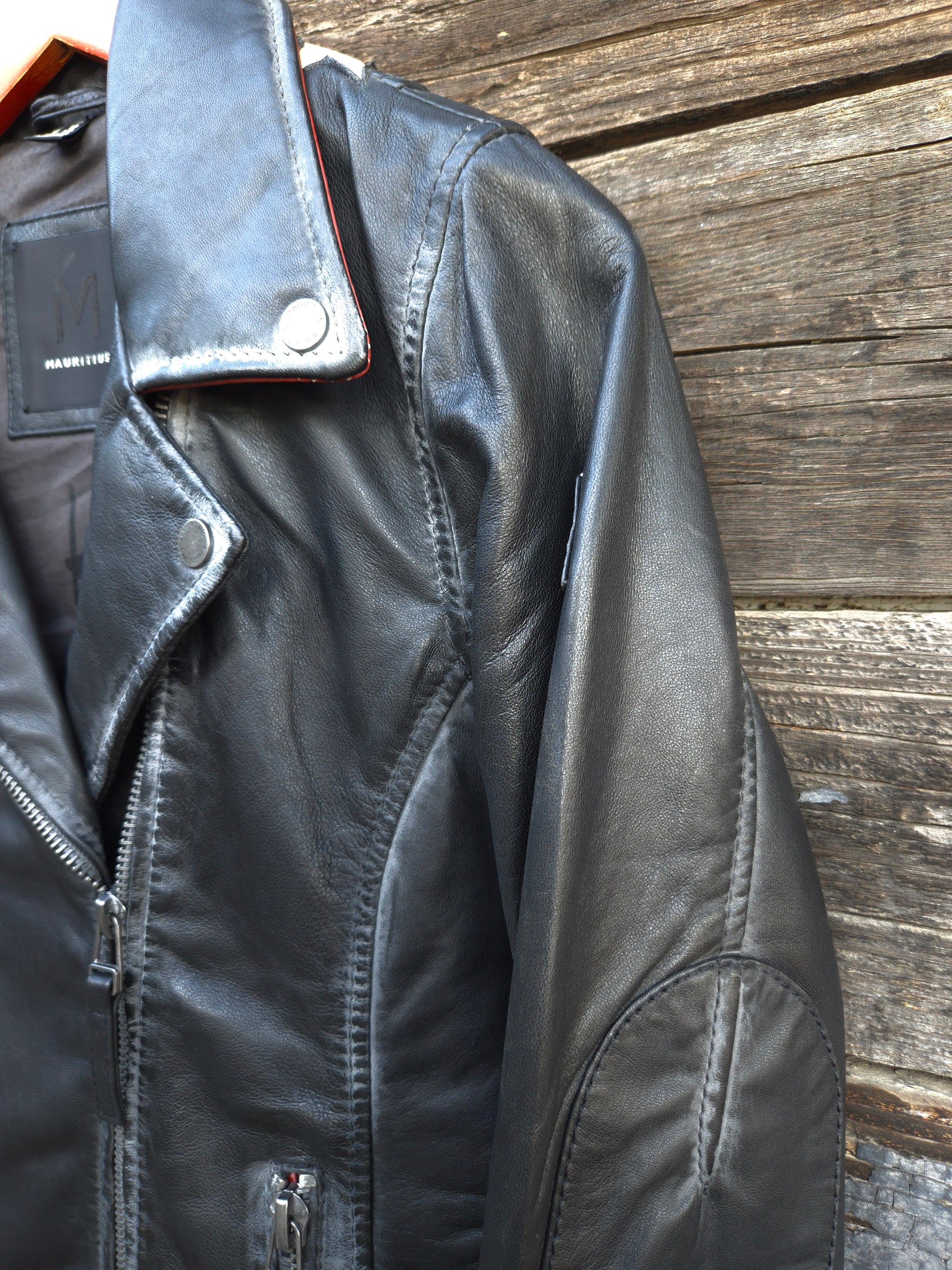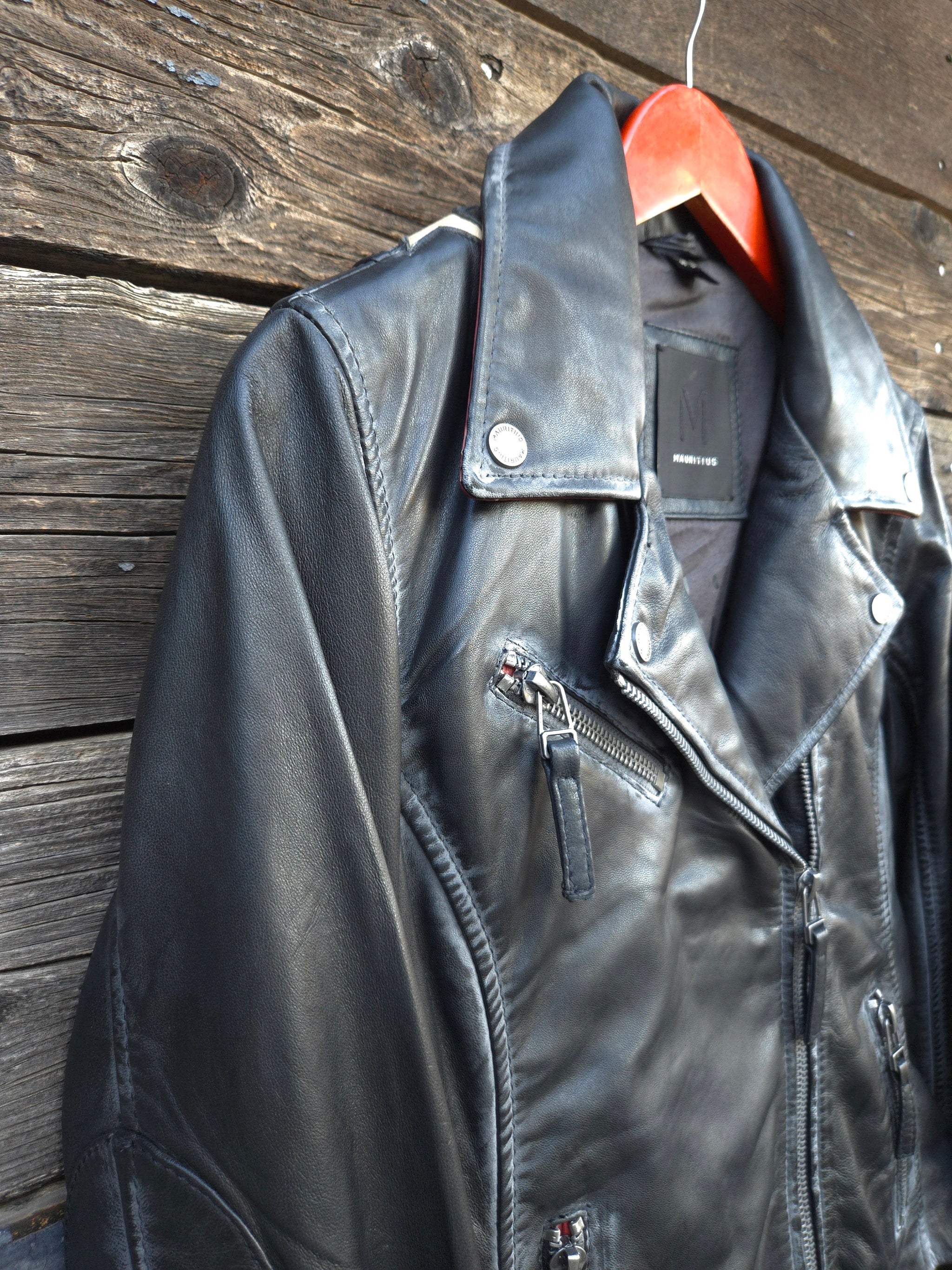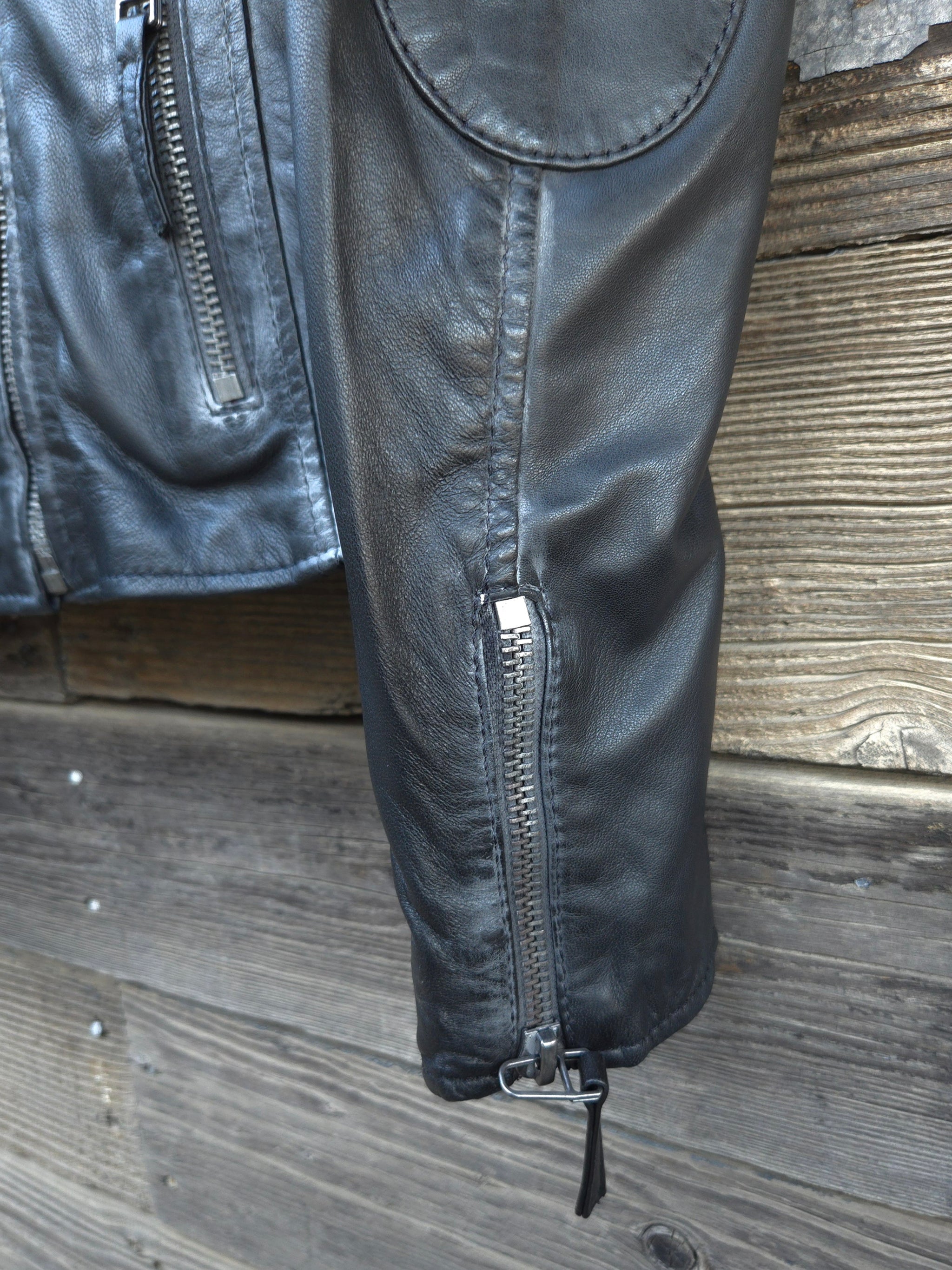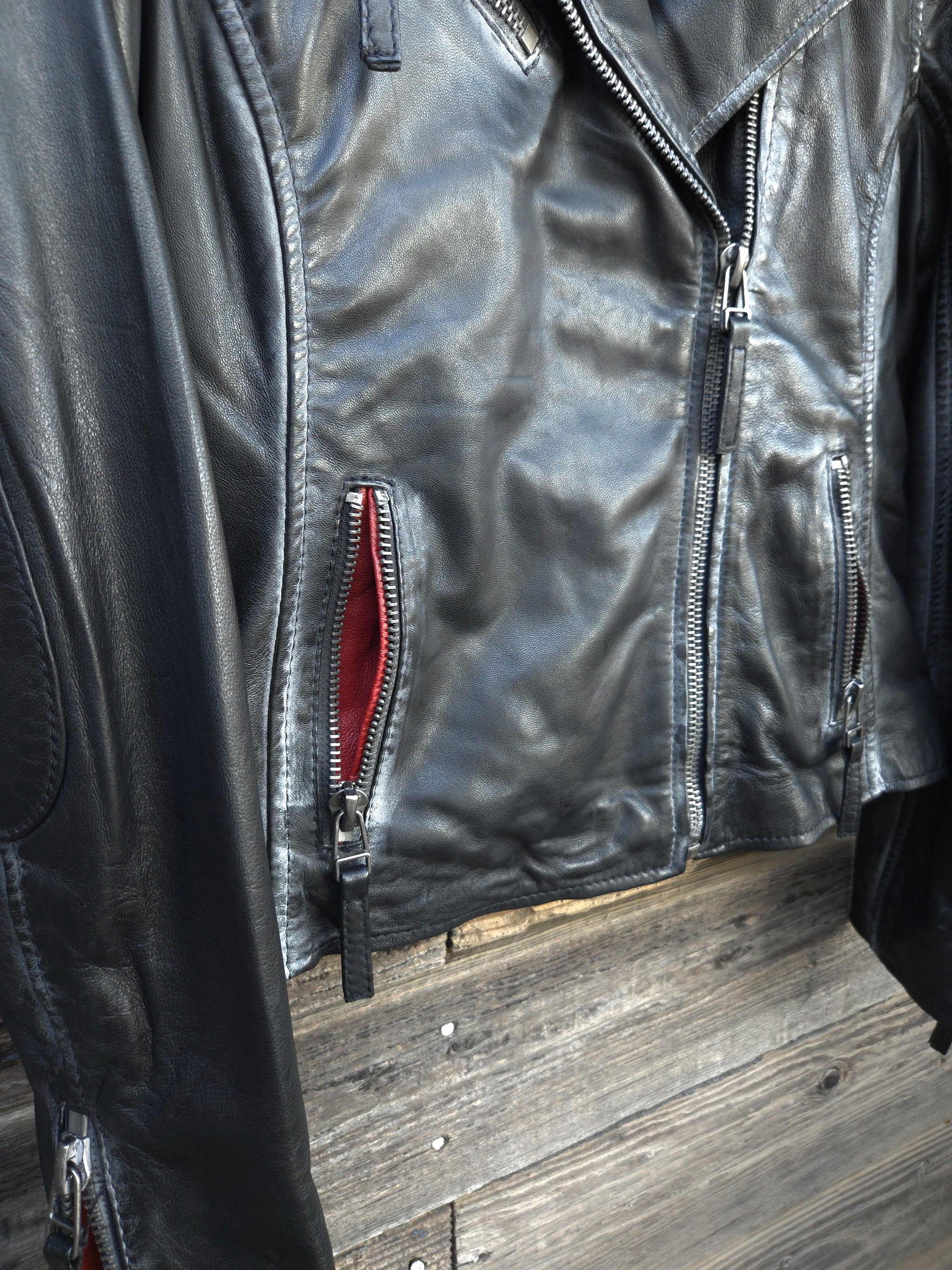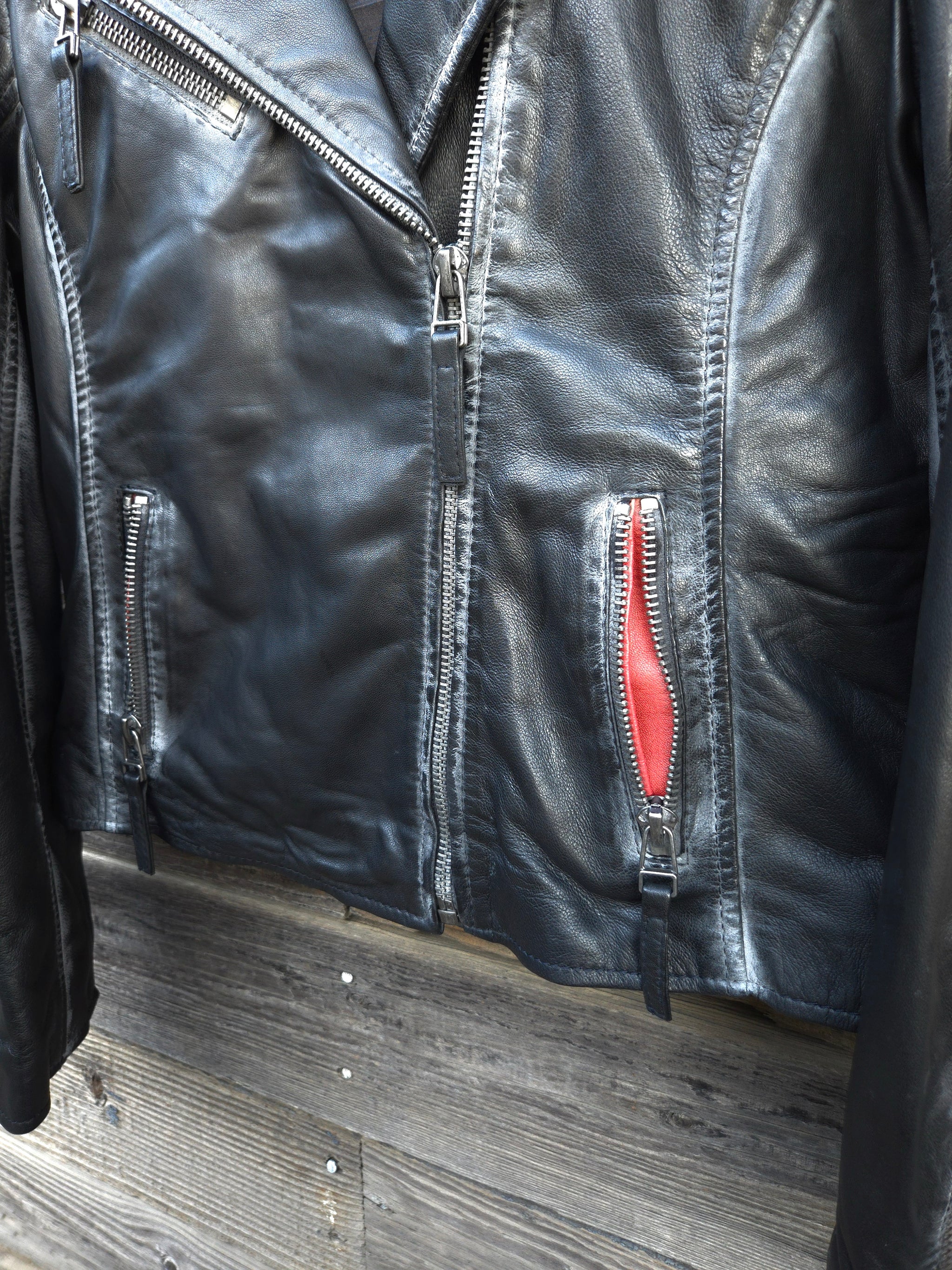 Star Spangled Leather Jacket. Lambskin leather, with a cotton liner. Beautiful bone colored leather stars emblazons the back of the jacket. The seams are gently polished for a distressed effect, the inside of the pockets, inside of the cuff zips and under the collar give a fabulous contrast pop of color!