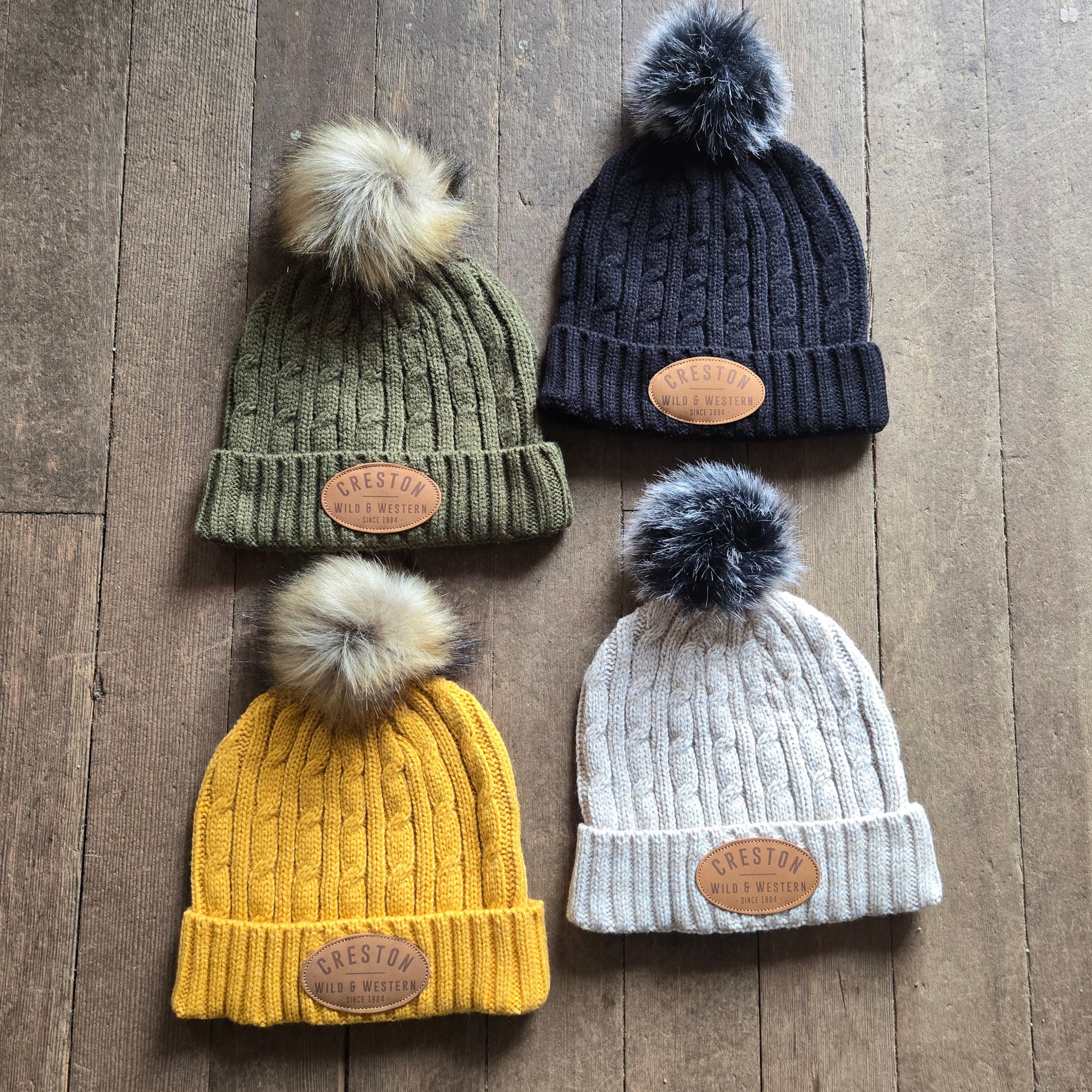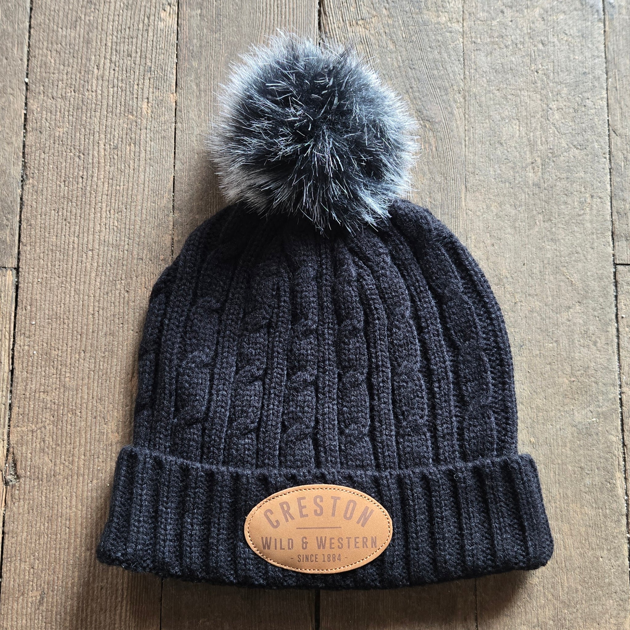 Creston Beanie with Leather Patch. Cable knit with PomPom.