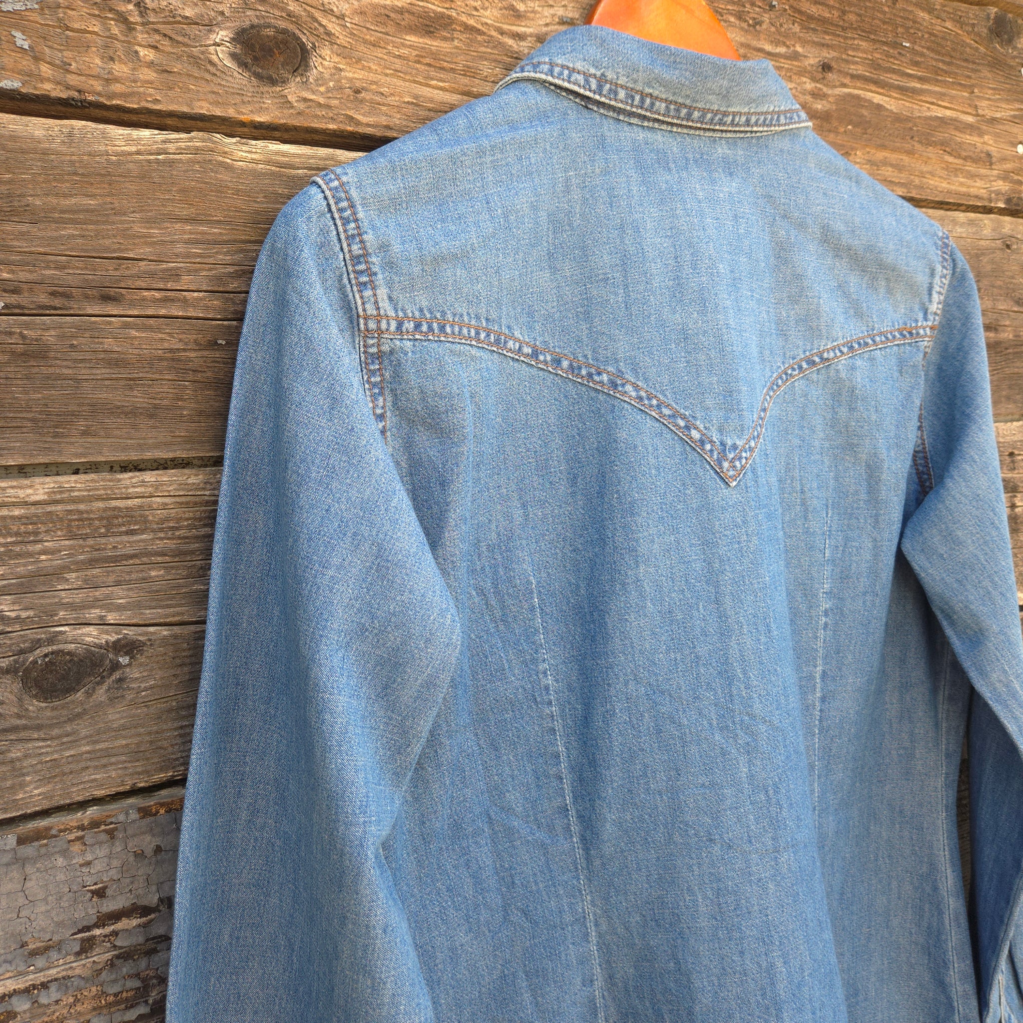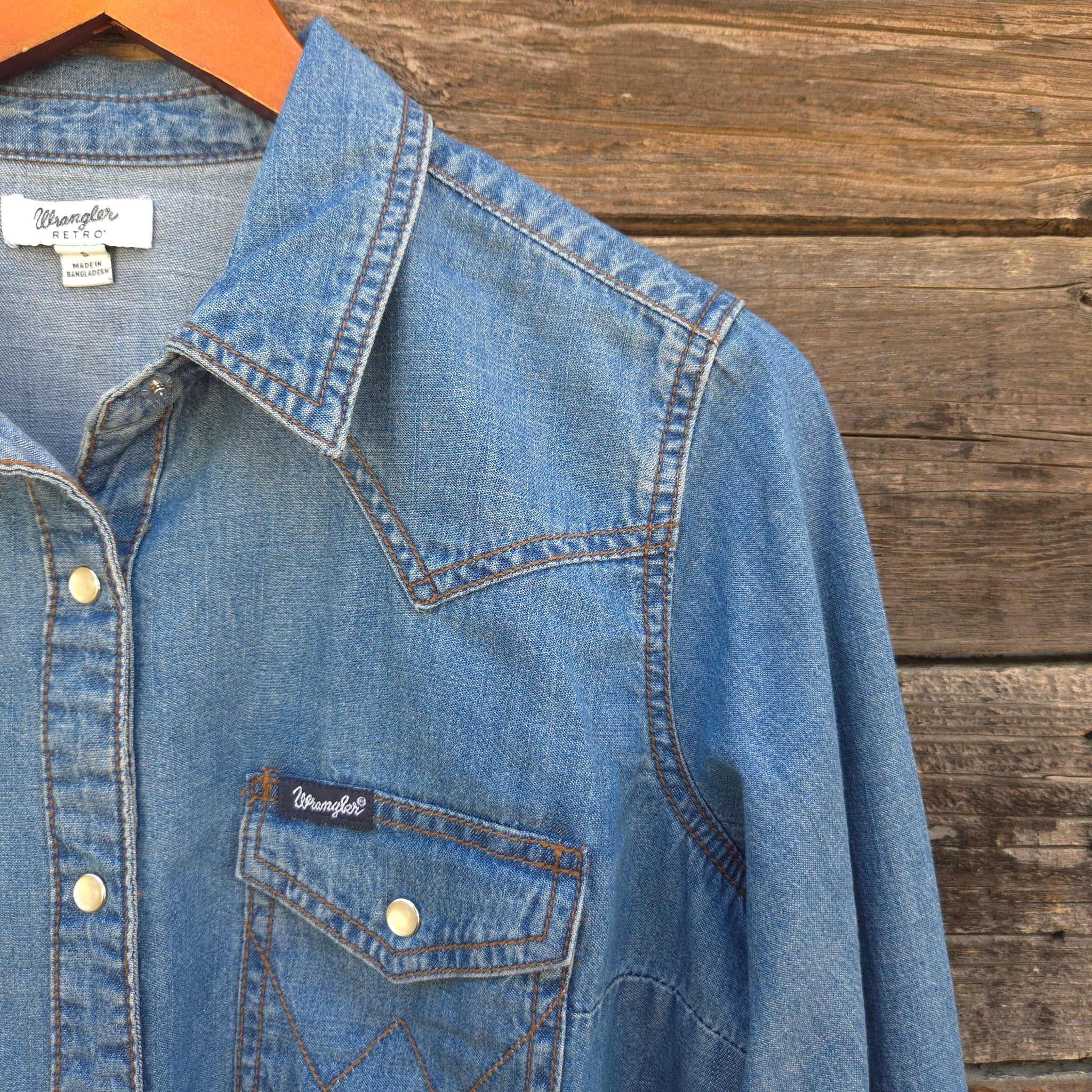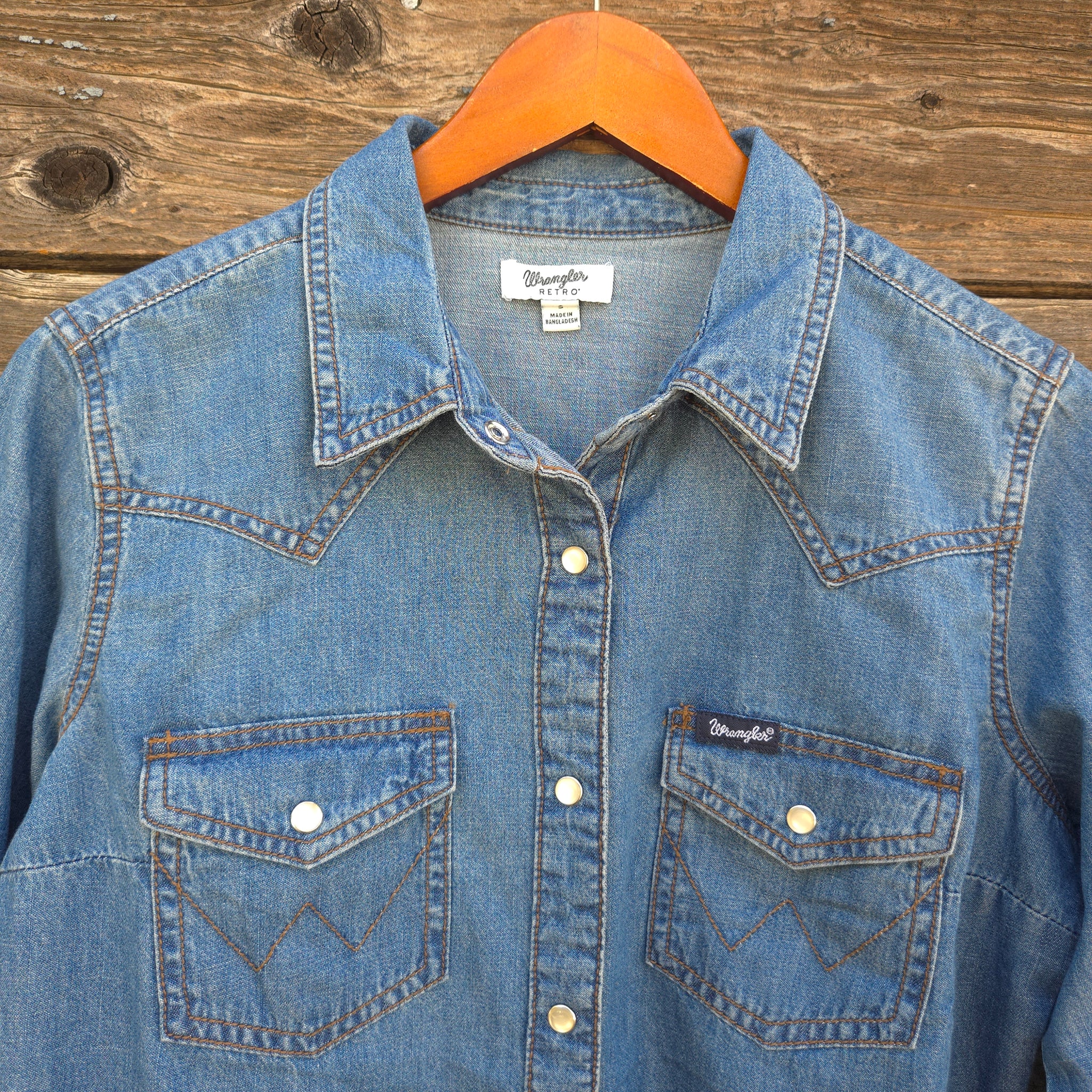 No Western wardrobe would be complete without a classic snap shirt. Combining the 100% cotton denim you love with the clean and simple silhouette you can always depend on, the women's Wrangler Western snap denim shirt offers up vintage cowgirl style with some contemporary attitude. This long-sleeve snap shirt comes with many of the iconic Wrangler details you look for as signs of superior quality, including Western front and back yokes and genuine pearl snaps as well as snap flap pockets with our signature 'W' embroidery. Whether you wear it during the week or you save it for the weekend, you're guaranteed to get compliments anywhere you go.