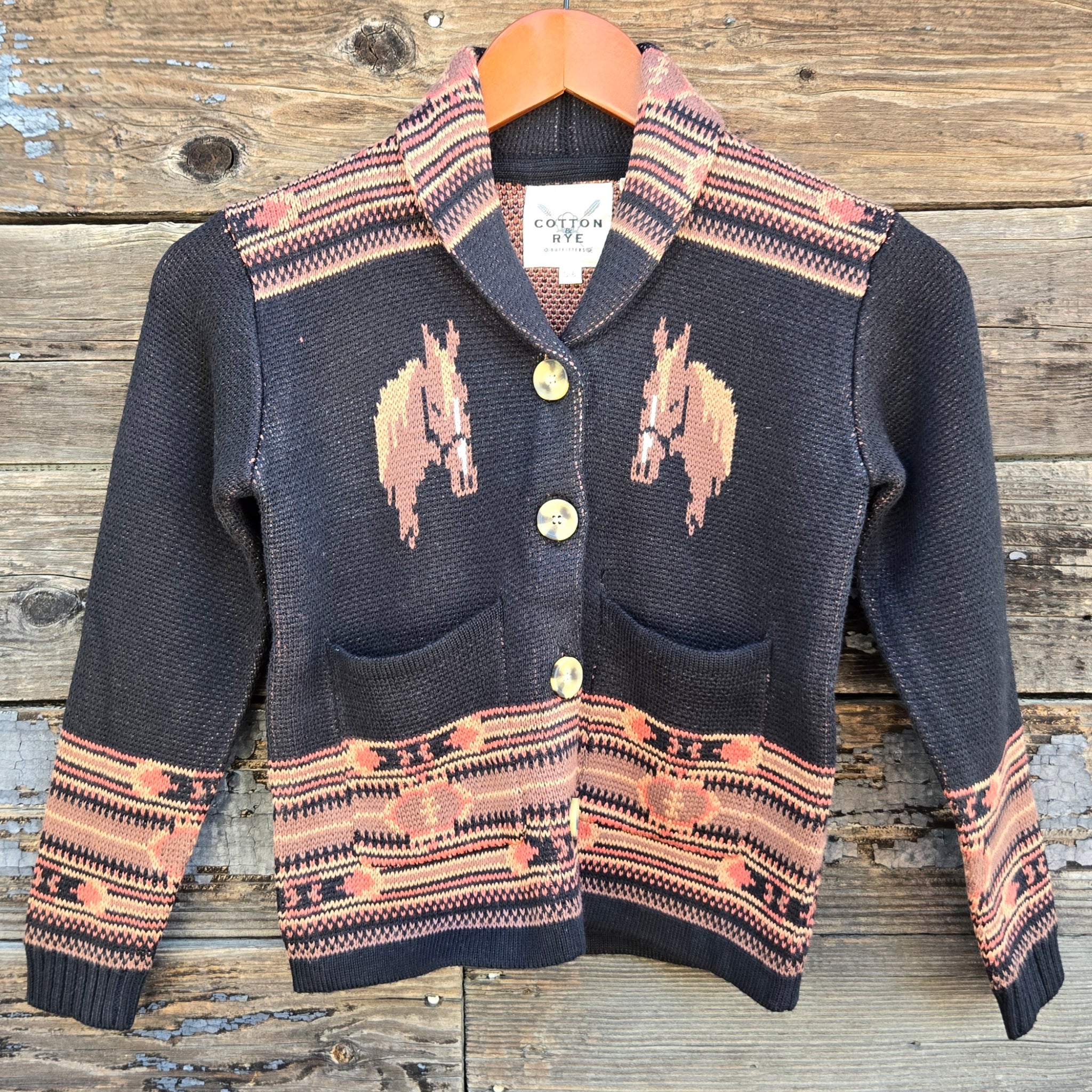 Cotton and Rye Vintage Inspired Horse and Horseshoe Cardigan. Shawl collar, large buttons, and two patch pockets. Designs on the front and back.